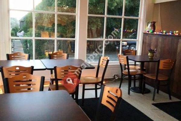 From the corner windows of Tote Fête Deli in historic Mendocino, CA you have unobstructed views of the crashing breakers in Mendocino Cove where Big River surges into the sea.
